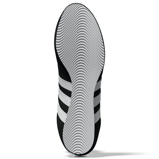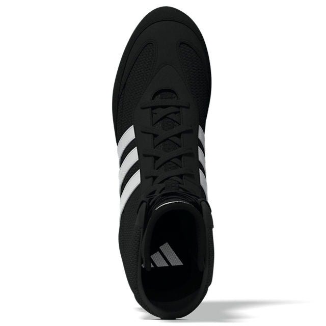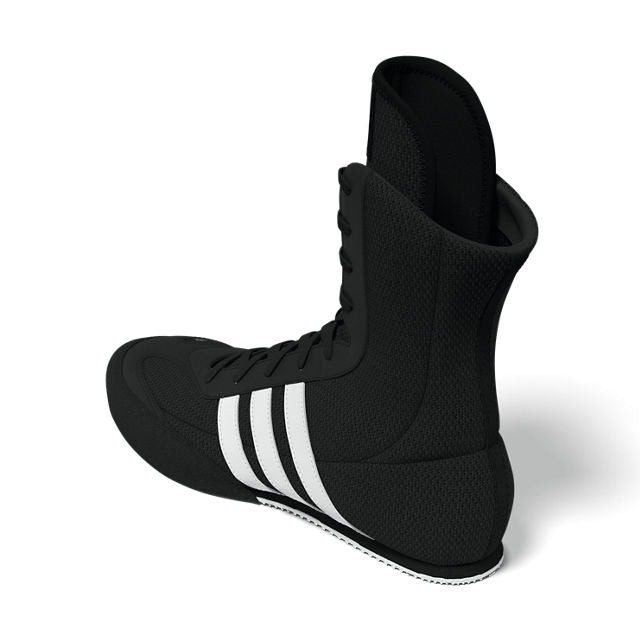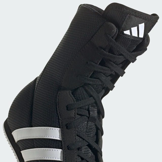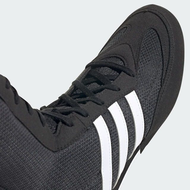 The Adidas Box Hog 2 boxing boots deliver agile performance with a breathable mesh upper and a low-profile cushioned midsole. A gum rubber outsole provides traction and grip. Low-profile partial EVA midsole for lightweight midfoot and heel cushioning. The sturdy single-layer open mesh upper construction allows for superior climate control and synthetic suede overlays for durability and comfort. The classic Adidas woven textile 3-Stripes shows your wearing quality and style.